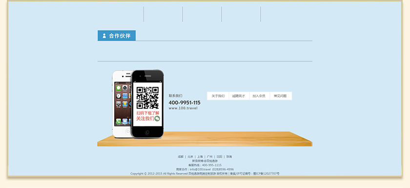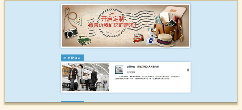 Project Description 百悦逸游于2012年初由二位资深的旅行家创办,是成都传媒集团旗下成都新闻国际旅行社有限公司的高端旅游品牌,总部位于成都高新区天府大道中段美年广场。在百悦逸游成立之前,创始团队亲自到全球三十多个国家实地考察,带着第一手的资讯和执着的信念创立了中国西部第一家真正意义上的私人定制旅行机构。百悦的旅行不是跟团挤大巴,不是十天去十个国家,更不是没完没了的... Official website address 合肥http://www.100.travel I want to share